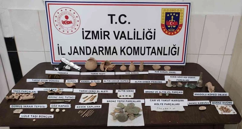 İzmir İl Jandarma Komutanlığı ekipleri, Torbalı ilçesi Ayrancılar Mahallesinde tarihi eser ticareti yapılacağı bilgisi üzerine harekete geçti. Torbalı Cumhuriyet Başsavcılığının koordine ve talimatları doğrultusunda, Torbalı İlçe Jandarma Komutanlığı ekiplerince yapılan yol kontrolünde, belirlenen araç durduruldu. Araç içerisinde yapılan aramalarda, Osmanlı, Roma ve Bizans dönemine ait olduğu değerlendirilen 4 adet sikke, 1 adet gümüş ikram tepsisi, 1 adet kaplumbağa uyarı düdüğü, 3 adet kan sunağı, 1 adet kandil, 10 adet altın kolye, 1 adet altın toka, 2 adet altın küpe, 35 adet bronz elbise düğmesi, 1 göz yaşı şişesi, 1 adet tarihi Anadolu köpeği objesi ve 30 adet tarihi eser niteliğinde obje olmak üzere toplam 90 parça tarihi eser ele geçirildi. Ayrıca şüpheli üzerinde yapılan aramada da bir tabanca ele geçirildi.