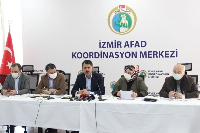 İzmir Afet Koordinasyon Merkezinde sabah yapılan koordinasyon toplantısının ardından Çevre ve Şehircilik Bakanı Murat Kurum, Aile, Çalışma ve Sosyal Hizmetler Bakanı Zehra Zümrüt Selçuk ve Tarım ve Orman Bakanı Bekir Pakdemirli son duruma ilişkin açıklamalarda bulundu.