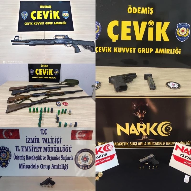 İzmir’in Ödemiş ilçesinde polis ekiplerince yapılan asayiş ve trafik uygulamalarında çok sayıda silah ve esrar maddesi ele geçirildi.