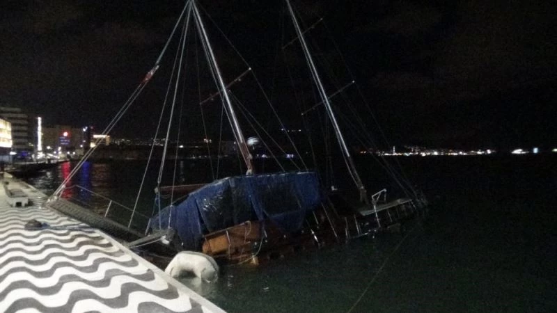 İzmir’in Konak ilçesinde fırtına sebebiyle oluşan dalgalarda su alan bir tekne yan yattı.