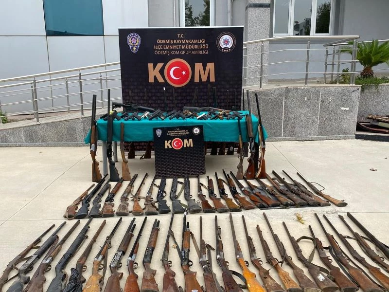 Ödemiş İlçe Emniyet Müdürlüğü Kaçakçılık ve Organize Suçlarla Mücadele (KOM) Grup Amirliği ekipleri, Tire ilçesi Yeni Mahalle Uzun Sokak’ta bulunan bir iş yerinde kuru sıkı tabancaların namlularının değiştirilerek gerçek silaha dönüştürüldüğü bilgisine ulaştı. Ekipler tarafından belirlenen adrese düzenlenen operasyonda; 62 ruhsatsız tüfek, 16 kuru sıkından bozma tabanca, 1 ruhsatsız tabanca, 1 kesik tüfek ve çok sayıda silah aparatı yapımında kullanılan malzeme ele geçirildi. Olayla ilgili A.K.K., isimli bir şüpheli ise gözaltına alındı.