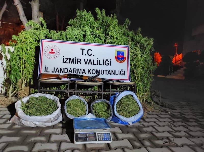 İzmir İl Jandarma Komutanlığına bağlı ekipler, Kiraz ilçesi Umurlu Mahallesi Sağlaşık mevkiinde bir ev ve bahçesinde uyuşturucu madde olduğu bilgisi üzerine çalışma başlattı. Harekete geçen ekiplerin adrese düzenlediği operasyonda 70 kök kenevir bitkisi, 4 bin 576 gram kubar esrar, 1 adet yarı otomatik av tüfeği, 1 adet kuru sıkı tabanca ve 1 adet hassas terazi ele geçirildi.
