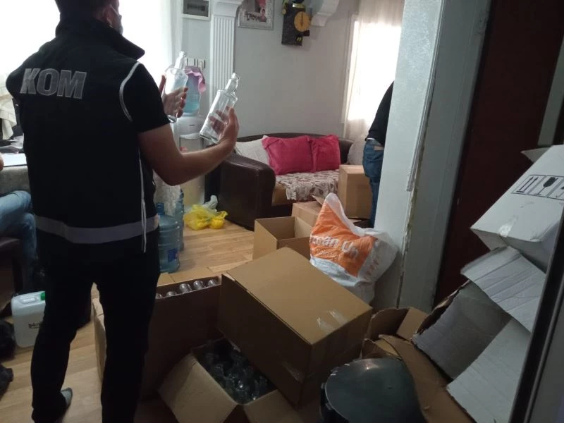 Bugün saat 06.00’da 4 şüpheliye yönelik operasyonda yapılan aramalarda, toplam 141 litre muhtelif ebatlarda kaçak rakı, 13 litre etil alkol, 2 adet 250 litrelik alkol yapımı için kullanılan tank, 275 boş şişe, 18 bin adet içki şişesi için etiket, 550 adet kapak, 1 adet ruhsatsız tabanca ve mermiler ele geçirildi.