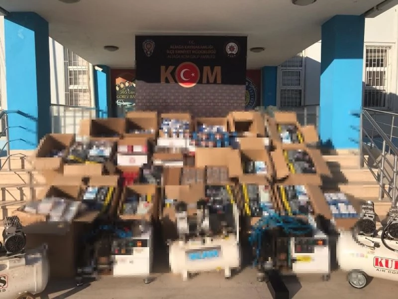 Edinilen bilgiye göre, Aliağa İlçe Emniyet Müdürlüğü Kaçakçılıkla Mücadele Grup Amirliği sorumluluk bölgesinde bulunan Menemen ilçesinde, tütün ve bundan üretilen kaçak sigara faaliyetlerinin önlenmesine yönelik olarak yapılan çalışmalar kapsamında bir iş yerinde arama yapıldı. 20’li paketler içerisinde toplamda 2 bin 200 adet içi tütün ile doldurulmuş makaron ele geçirildi. Olayla ilgili olarak bir şüphelinin ikametinde yapılan aramada ise 58 bin 650 adet kıyılmış tütünle doldurulmuş makaron, 13 bin adet şeffaf poşet 9 bin 075 paket boş sigara kutusu, 56 bin 400 adet boş makaron, 2 adet sigara doldurma makinesi, 3 adet kompresör, 580 adet kopartılmış TAPDK bandrolü bulundu.
