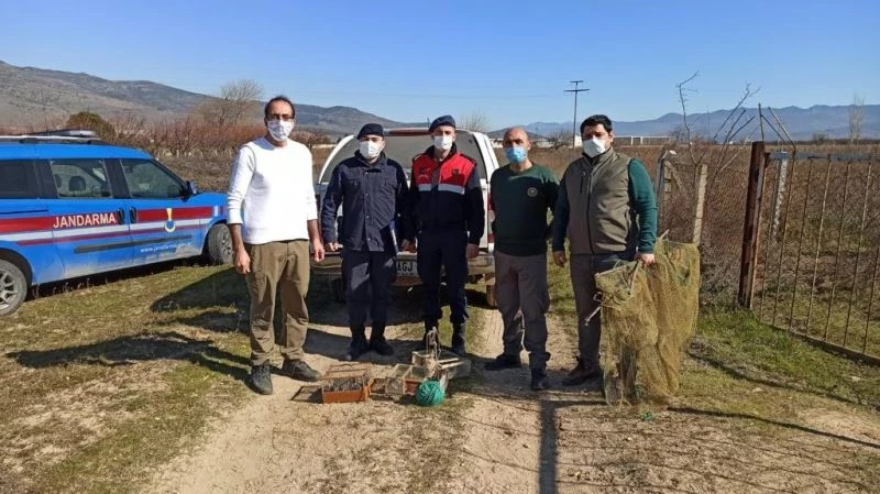 İzmir İl Jandarma Komutanlığı Çevre Koruma Timi ve Menemen İlçe Jandarma Komutanlığı ekipleri, Menemen ilçesi Çavuş Mahallesi’nde bulunan Gediz Nehri kenarında neslinin tükenme tehlikesine karşı koruma altına alınan saka kuşlarının tuzakla avlandığı ihbarını aldı. İhbar üzerine harekete geçen ekipler, bölgede yapılan kontrollerde H.Ç. isimli şahsın tuzakla saka kuşu avladığını tespit etti. Ekipler, yapılan aramalarda avda kullanılan 5 metrekarelik ağ, 20 metre tuzak ipi, 12 metre beyaz ağ ipi, 3 adet el yapımı ahşap kuş kafesi, 40 adet canlı saka cinsi kuş ele geçirdi. Ele geçirilen malzemeler İzmir Doğa Koruma ve Milli Parklar İl Müdürlüğüne teslim edilirken, kuşlar doğaya bırakıldı. H.Ç. isimli şahsa ise Kara Avcılığı Kanunu gereğince 41 bin 45 TL idari para cezası uygulandı.
