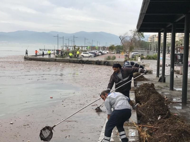 Önceki gece sabaha kadar yağan aşırı yağmurun ardından İzmir Büyükşehir Belediyesi ekipleri kentte yaşamı normale döndürmeye yönelik çalışmalarını sürdürürken, körfezden de 25 ton çöp toplandı.