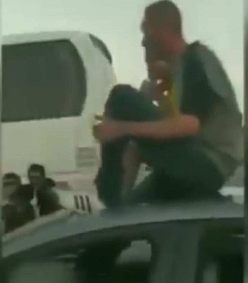 Öte yandan, cep telefonu ile kaydedilen görüntülerde, video çeken şahsın "Harikasınız" demesi üzerine araç üstüne çıkan şahıslar gülümseyerek poz verdi. Trafik magandası yanından geçen araç sürücülerinin şaşkın bakışları arasında yoluna devam etti.