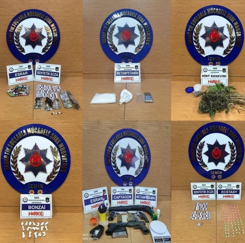 İzmir İl Emniyet Müdürlüğü Narkotik Suçlarla Mücadele Müdürlüğü ekipleri, 14 - 20 Haziran tarihleri arasında kent genelinde çok sayıda operasyon ve uygulama gerçekleştirdi. Ekipler tarafından gerçekleştirilen aramalarda 124 gram esrar-skank, 4 gram kokain, 6 gram eroin, 17 kök kenevir, 11 gram sentetik kannabinoid, 233 gram metamfetamin, 181 adet ecstasy maddesi, 623 adet sentetik ecza maddesi, 10 adet captagon, 6 tabanca 2 tüfek, 6 şarjör, 143 adet fişek ele geçirildi.