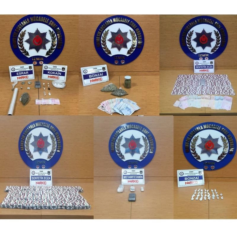 İzmir’de bir hafta içerisinde polis ekipleri tarafından gerçekleştirilen uyuşturucu operasyonlarında çok sayıda uyuşturucu madde ele geçirilirken, olaylarla ilgili 58 şüpheli hakkında işlem yapıldı; 16 şüpheli tutuklandı.