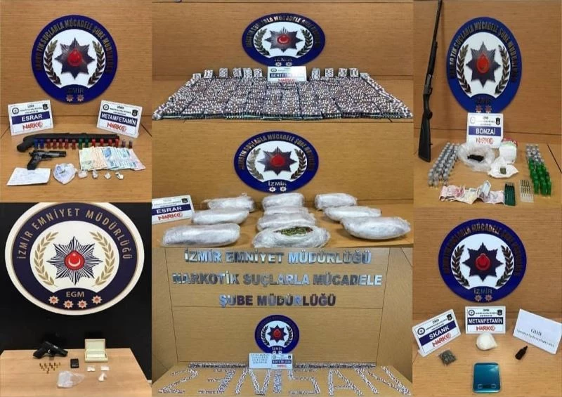İzmir İl Emniyet Müdürlüğü Narkotik Suçlarla Mücadele Şube Müdürlüğü ekiplerinin, 19-25 Nisan tarihleri arasında gerçekleştirdiği operasyonlarda 10 bin 351 gram esrar-skank, 9 gram kokain, 24 gram GHB, 56 sentetik kannabinoid, 135 gram captagon, 505 gram metamfetamin, 38 bin 296 adet sentetik ecza, 2 ruhsatsız tabanca, 2 adet tüfek, 2 adet şarjör, 134 adet fişek ile 4 bin 395 lira para ele geçirildi.