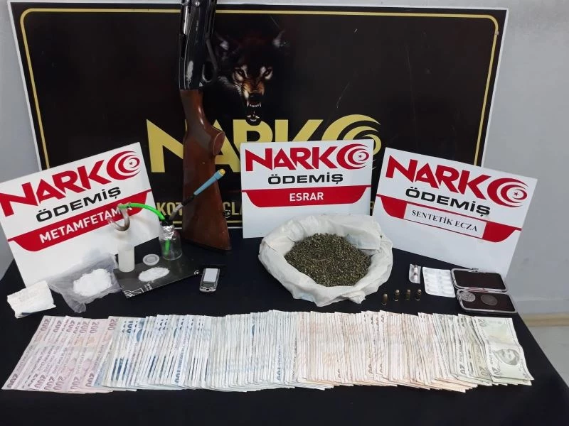 Ödemiş Narkotik Suçlarla Mücadele Grup Amirliği ekiplerince, uyuşturucu ile mücadele kapsamında yapılan çalışmalar hız kesmeden devam ediyor. Çalışmalar kapsamında ilçede bulunan bir eve düzenlenen operasyonda: 143 gram esrar maddesi, 21,5 gram metamfetamin, 10 sentetik ecza maddesi, 2 tarihi eser niteliği taşıdığı değerlendirilen madeni para, ruhsatsız tüfek, 4 adet 7.65 mm çapında fişek, uyuşturucu kullanmaya yarayan Bong olarak tabir edilen aparat, hassas terazi ve 14. 490 lira para ele geçirildi.