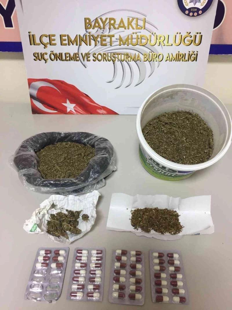 Bayraklı İlçe Emniyet Müdürlüğü Suç Önleme ve Soruşturma Büro Amirliği ekipleri, ilçede uyuşturucu madde ve ticaretine yönelik yapılan çalışmalar kapsamında, T.B. (36) isimli şüphelinin uyuşturucu ticareti yaptığını tespit etti. Savcılıktan gelen talimat ile şüphelinin adresinde yapılan aramada, 607 gram esrar ve 48 adet yeşil reçeteye tabi olan uyuşturucu hap ele geçirildi.