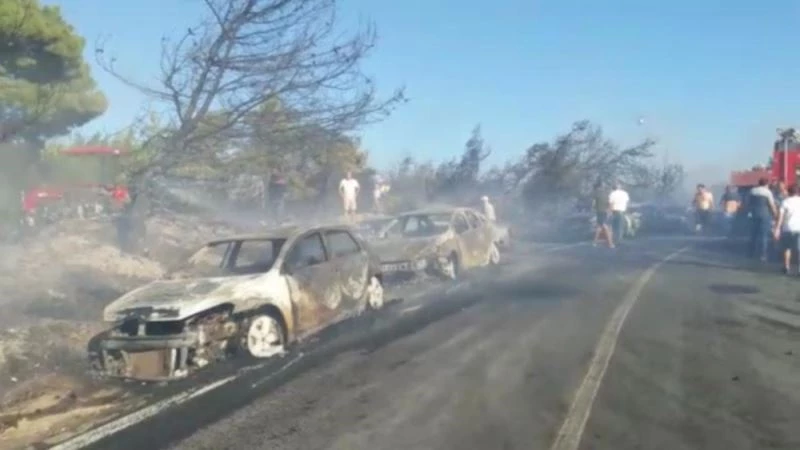 İzmir’in Seferihisar ilçesindeki otluk alanda çıkan yangın, bir anda o sırada plajda bulunan vatandaşların park halindeki araçlarına sıçradı. Onlarca aracın alev alev yandığı yangın, havadan ve karadan müdahalelerle güçlükle kontrol altına alınabildi.