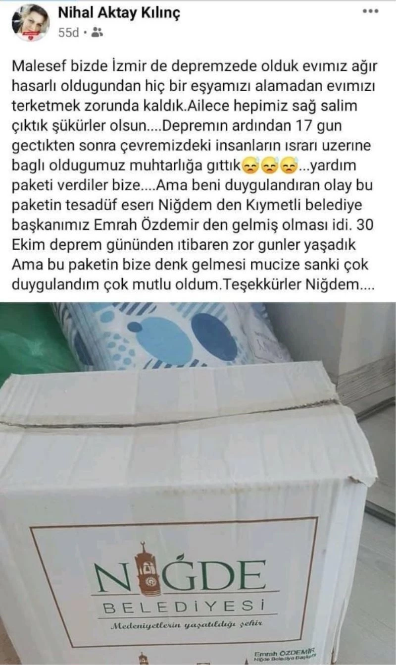 Nihal Aktay Kılınç mesajında; “Maalesef bizde İzmir’de depremzede olduk evimiz ağır hasarlı olduğundan hiçbir eşyamızı alamadan evimizi terk etmek zorunda kaldık. Ailece hepimiz sağ salim çıktık şükürler olsun. Depremin ardından 17 gün geçtikten sonra çevremizdeki insanların ısrarı üzerine bağlı olduğumuz muhtarlığa gittik. Yardım paketi verdiler bize. Ama beni duygulandıran olay bu paketin tesadüf eseri Niğdem’den kıymetli Belediye Başkanımız Emrah Özdemir’den gelmiş olmasıydı. 30 ekim deprem gününden itibaren zor günler yaşadık. Ama bu paketin bize denk gelmesi çok duygulandım çok mutlu oldum. Teşekkürler Niğdem” dedi.