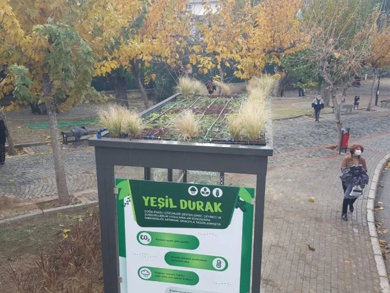 Doğal dokudan yoksun yerler için düşünülen Yeşil Durak Projesi, ilk etapta Halkapınar Aktarma Merkezi için planlandı. Konak Bahribaba Parkı’na konulan ilk örnek beğenilirse Halkapınar’daki tüm otobüs duraklarına uygulanacak. Öte yandan durakların çatısına güneş panelleri de eklenerek, kendi enerjisini üretebilir olması planlanıyor.