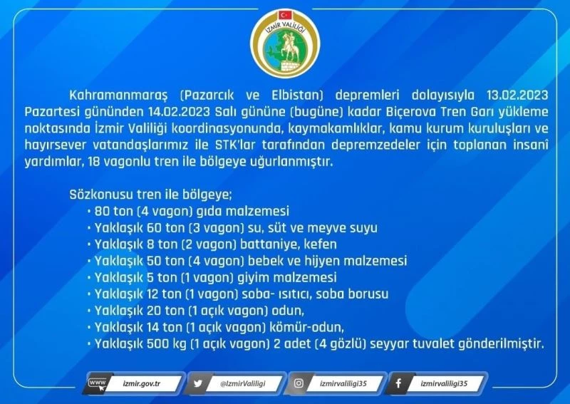 İzmir Valisi Yavuz Selim Köşger, konuyla ilgili sosyal medya hesabından yaptığı paylaşımda, “Kahramanmaraş (Pazarcık ve Elbistan) depremleri dolayısıyla dün ve bugüne kadar Biçerova Tren Garı yükleme noktasında İzmir Valiliği koordinasyonunda, kaymakamlıklar, kamu kurum kuruluşları ve hayırsever vatandaşlarımız ile STK’lar tarafından depremzedeler için toplanan insani yardımlar, 18 vagonlu tren ile bölgeye uğurlanmıştır.” ifadelerine yer verdi.