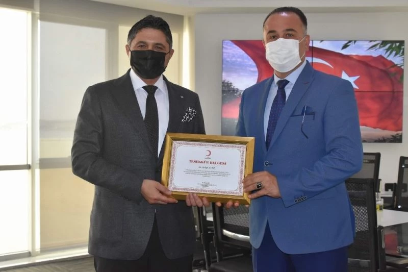 Ziyarette Türk Kızılay Ege Bölge Kan Merkezi Müdürü Dr. Gökay Gök, Başkan Acar’a, Türk Kızılay’ına desteklerinden ötürü “Teşekkür Belgesi” takdim etti.
