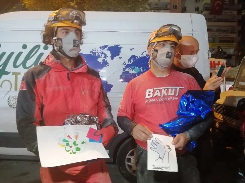 İzmirli çocuklar, kentte meydana gelen depremin ardından 4 gün enkaz başında arama kurtarma ekiplerine sürpriz yaptı. Bursa Atama Kurtarma (BAKUT) ekiplerine çizdikleri resimleri ve çoraplar yollayan çocuklar duygulandırdı.