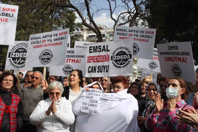 İzmir 5. İdare Mahkemesinin emsal artışında kamu yararı olmadığına hükmederek yürütmeyi durdurma kararı vermesi üzerine kefen ve çadırla açıklama yapan İzmir Depremzedeleri Derneği (İZDEDA) üyeleri, karara tepki gösterdi.