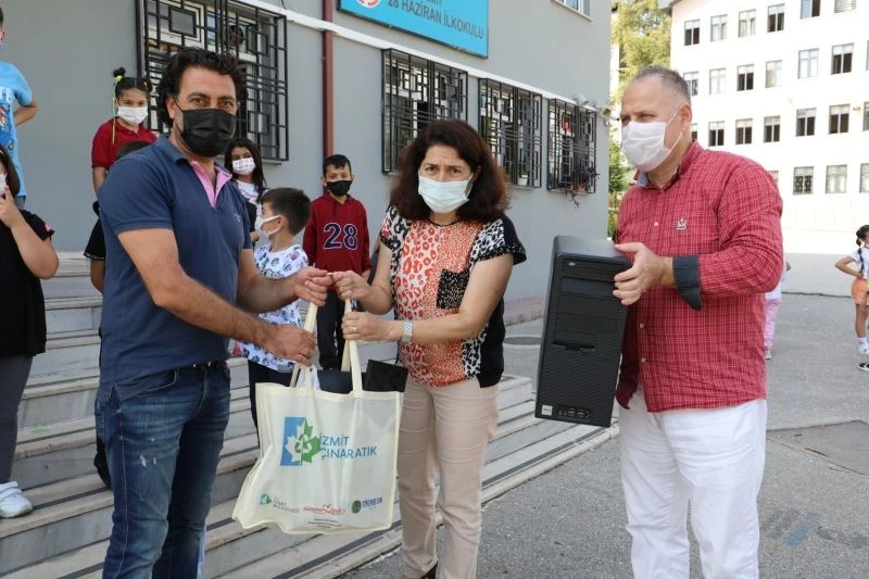 İzmit Belediyesi çocuklara çevre bilinci aşılamak adına okullarda geri dönüşüm projeleri yapmaya devam ediyor. İzmit Belediyesi Çevre Koruma ve Kontrol Müdürü Havva Açıkgöz, 28 Haziran İlkokulu 2-B sınıfı öğrencilerine geri dönüşüm projesine verdikleri katkılardan dolayı bilgisayar hediye etti. Öğrenciler ve okul yöneticileri İzmit Belediyesine hediye bilgisayardan ötürü teşekkürlerini iletti.
