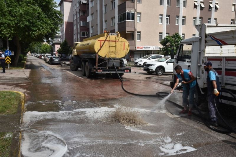 Atatürk Bulvarı’nı boydan boya tazyikli ve köpüklü suyla yıkayan ekipler, aşırı yağıştan dolayı yolda biriken çamur ve molozları kaldırdı. Trafiği aksatmamak adında çalışmalarını yoğun bir şekilde sürdüren ekipler, kısa sürede yolu tamamen temizledi.