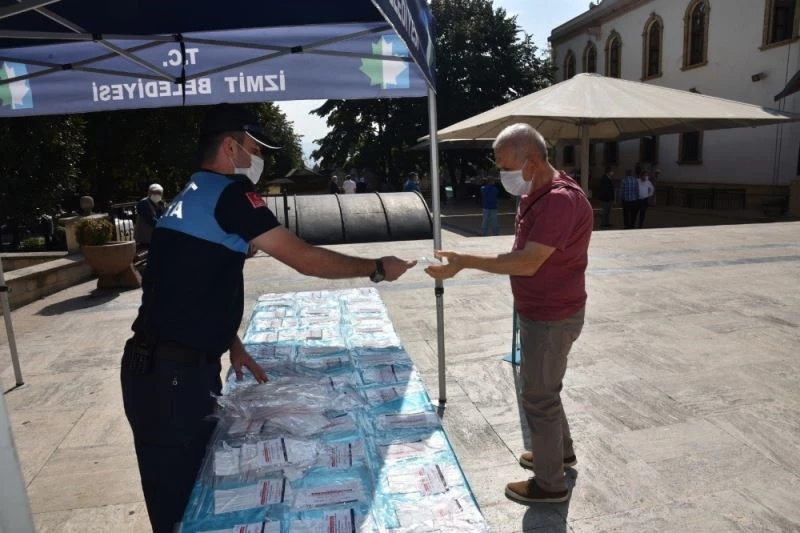 İzmit Belediyesi Zabıta Müdürlüğü ekipleri, Fevziye Cami önüne stant kurarak Cuma Namazı öncesi vatandaşlara maske dağıttı.