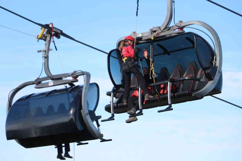 Senaryo gereği teleferikte mahsur kalan iki kişiyi kurtaran ekipler, telesiyej tellerine tırmanarak halat üzerinde hünerlerini sergiledi. Ekipler tarafından mahsur kalan vatandaşlar başarılı bir şekilde kurtarıldı.