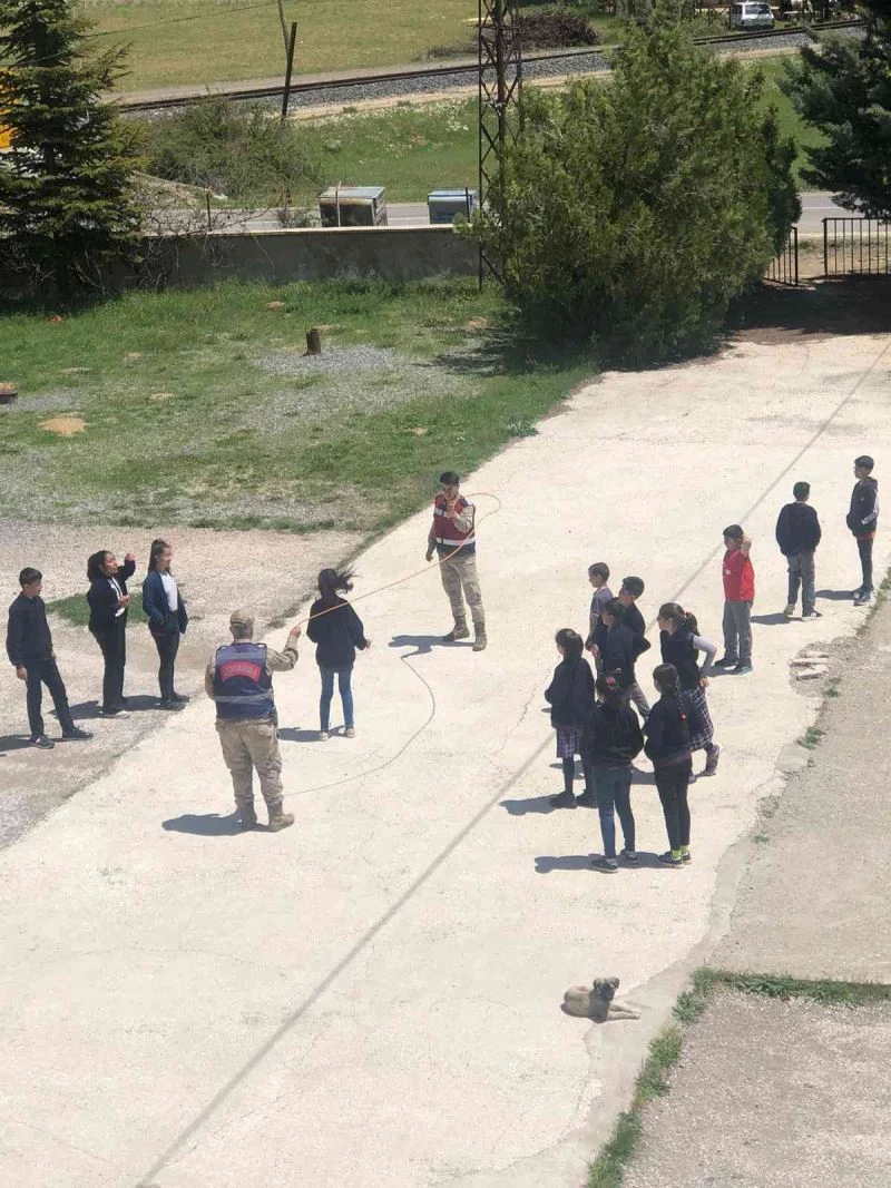 Maden ilçesine bağlı Gezin köyünde jandarma karakol komutanı, Vali Aydın Arslan Ortaokulu’nu ziyaret etti. Ziyaret sırasında astsubay ve uzman çavuşlar, okulun bahçesinde oyun oynayan öğrencilere eşlik etti. Jandarma görevlileri ipi çevirirken, öğrenciler de atladı.