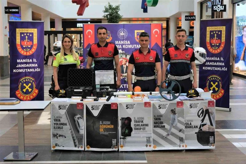 Manisa İl Jandarma Komutanlığı Trafik Şube Müdürlüğüne bağlı Motosikletli Trafik Timleri “Trafik Haftası” dolayısıyla açtıkları stantta vatandaşlara hem kullandıkları ekipmanları tanıttı hem de trafik kuralları hakkında bilgilendirmelerde bulundu. Minik ziyaretçilerini de ihmal etmeyen jandarma ekipleri onlara balon ve boyama kitabı hediye etti.