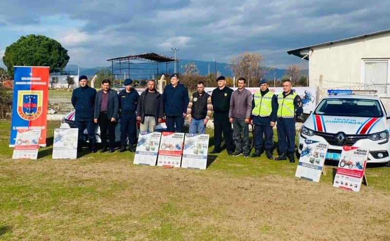 Aydın İl Jandarma Komutanlığı Trafik Şube Müdürlüğü tarafından, traktör ve motosiklet sürücüleri trafik kazalarının önlenmesine karşı bilgilendirirken, vatandaşlara broşür ve reflektör dağıtıldı.