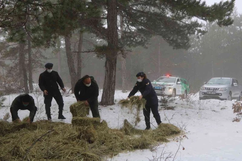 Çankırı’da jandarma ekipleri, kış mevsimi ile yiyecek bulmakta zorlanan yaban hayvanlara yem bırakırken, yemekhanede artan ekmeklerle sokak hayvanlarını besledi.
