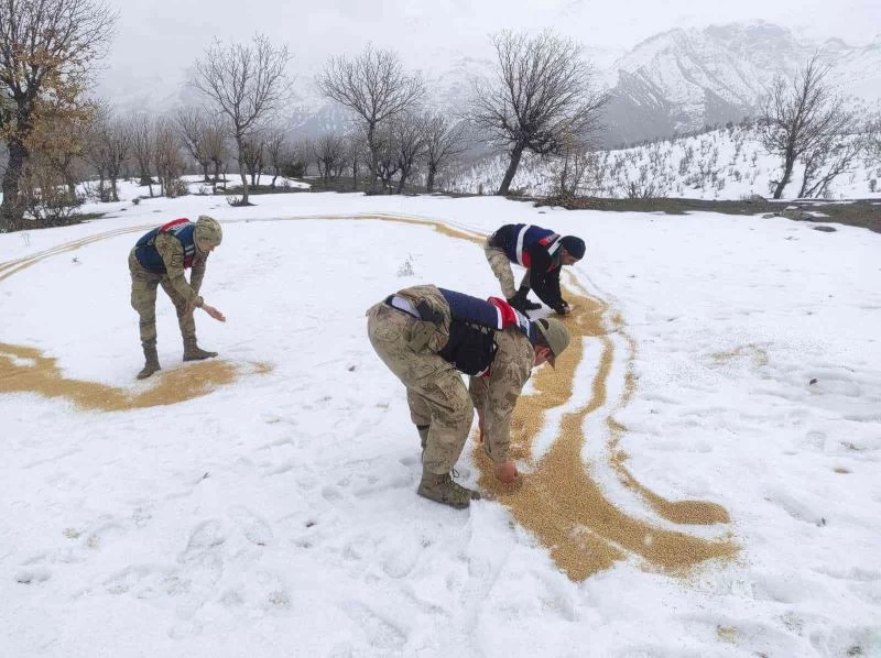 Batman’da, jandarma ekipleri ve Güvenlik Köy korucuları, kar yağışının yoğun olduğu kırsal alanlara yaban hayvanlarının yiyecek sıkıntısı çekmemesi için doğaya yem bıraktı.