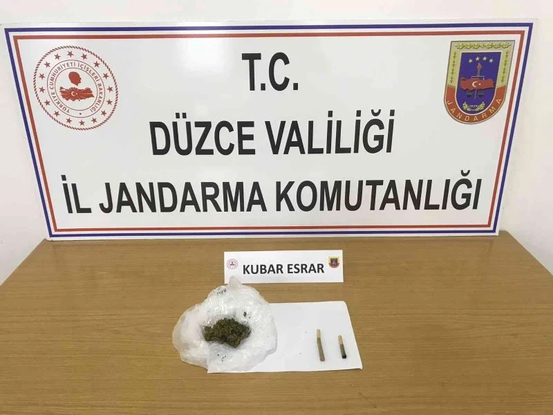 Akçakoca Jandarma Komutanlığı önünde yol kontrol uygulaması yapıldı. Jandarma ekipleri, durdurdukları otomobilde hareketlerinden şüphelendikleri sürücü Ö.E. üzerinde arama yaptı. 6.6 gram esrar maddesi ele geçiren jandarma ekipleri şahsı gözaltına aldı.
