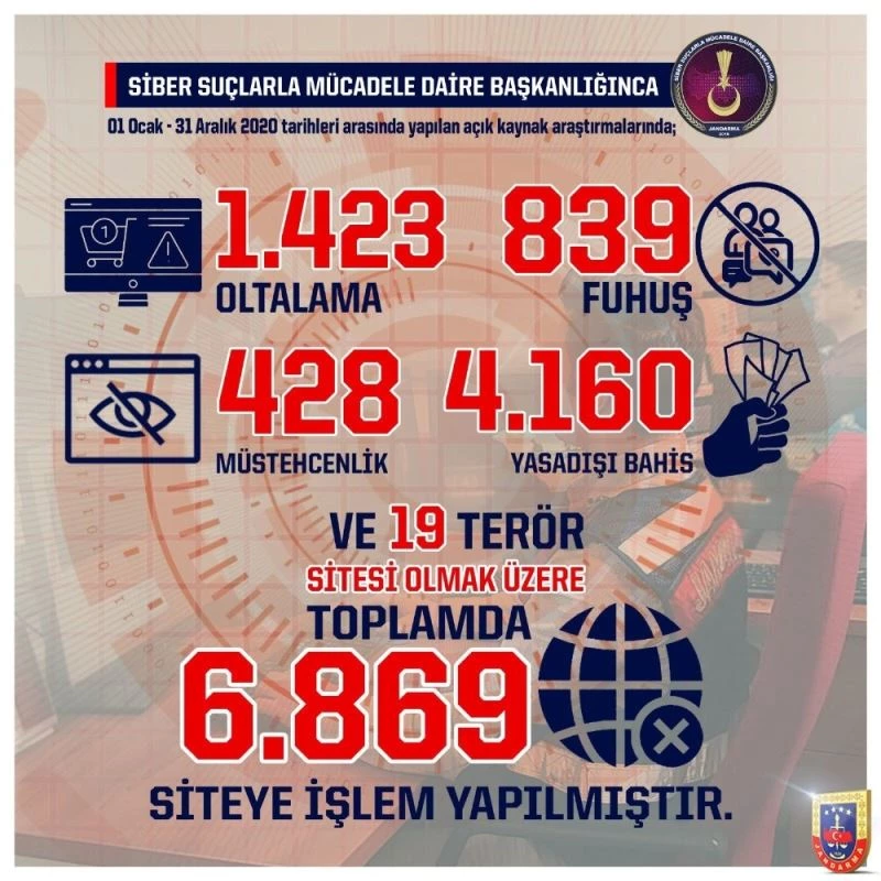 Jandarma Genel Komutanlığı Siber Suçlarla Mücadele Daire Başkanlığınca, 2020 yılında yapılan açık kaynak araştırmaları sonucunda; bin 423 oltalama, 839 fuhuş, 428 müstehcenlik, 19 terör ve 4 bin 160 yasa dışı bahis sitesi olmak üzere toplam 6 bin 869 siteye işlem yapıldı.