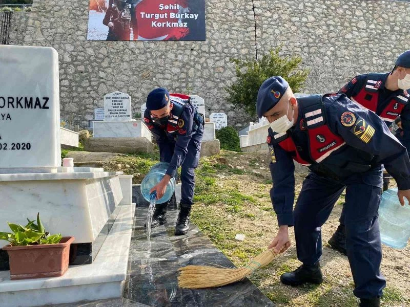 Antalya’nın Finike ilçesinde jandarma ekipleri, İdlib şehidi Turgut Burkay Korkmaz’ın kabrini temizledi.