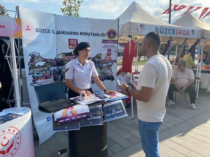 DÜZCE – Düzce Belediyesi’nin koordine ettiği Dünya Düzce Günleri’nde jandarma ekipleri ile Aile ve Sosyal Hizmetler ekipleri tarafından binlerce kişiye ‘Kades’ uygulamasının tanıtımı yapıldı.