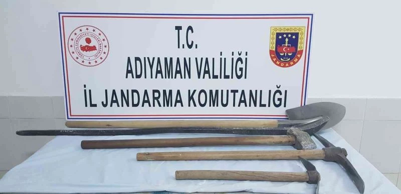 Adıyaman İl Jandarma Komutanlığa gelen ihbar üzerine harekete geçen ekipler Gölbaşı Savran köyünde izinsiz kazı yapan M.G., A.D., A.G ve Ö.G. isimli şahıslar kazı yaptıkları alanda suç üstü yakaladı. Kazı alanında 2 adet kazma, 1 adet demir murç, 1 adet balyoz, 1 adet kürek ele geçirildi.