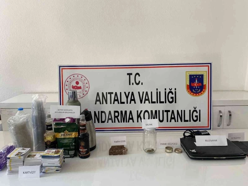 Kumluca Cumhuriyet Başsavcılığı koordinesinde; Yazır Mahallesi’nde uyuşturucu madde ile mücadelede çerçevesinde yapılan çalışmalar sonucunda, Olympos ve Çıralı sahilinde seyyar satıcılık yaptığı tespit edilen Y.G’nin evinde Adrasan Jandarma Karakol Komutanlığınca yapılan aramada, 5 gram esrar maddesi, 1 adet tarihi eser olduğu değerlendirilen materyal ele geçirildi. Ayrıca seyyar satıcılıkta kullanılan satışa hazır yiyecek malzemeleri ile bin adet seyyar satıcı kartviziti bulundu. Y.G.’ye idari para cezası uygulanıp adli işlemlere başlandı. Şüpheli ifadesinde uyuşturucu madde kullandığını, Olympos ile Çıralı sahilinde seyyar satıcılık yaptığını ve kendi adına kart bastırdığı ifade etti.