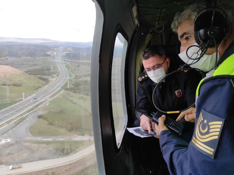 Kocaeli İl Jandarma Komutanlığı’na bağlı ekipler, helikopter ile Kuzey Marmara Otoyolu’nun Kocaeli İzmit ve İstanbul sınırı arasında kalan kısmını denetlendi. Gerçekleştirilen denetimde otoyolun 60 kilometrelik kesiminde Skorsky helikopterle kayıt altına alınan 200’e yakın araç gişelerde bekleyen ekipler tarafından durduruldu. Denetimlerde kural ihlali yapan sürücülere idari para cezası uygulandı. Ayrıca yolcu otobüsleri de tek tek durdurularak şüpheli şahıslar üzerinde uygulama gerçekleştirildi.