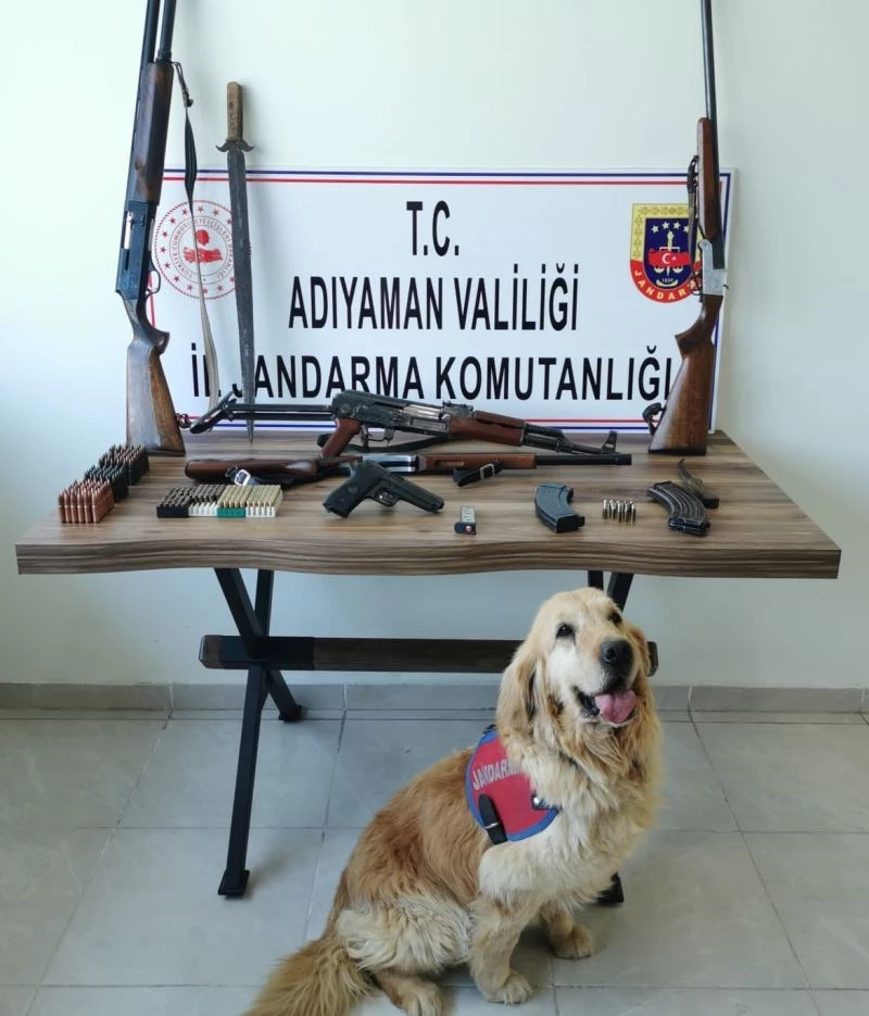 Adıyaman İl Jandarma Komutanlığı Merkez İlçe Jandarma Komutanlığı sorumluluk bölgesinde, silah ticareti yapıldığı bilgisi alınması üzerine sıkı takip ve titiz çalışma neticesinde bir şahsın evinde arama yapıldı. M.T. isimli şahsın evinde yapılan aramada 1 adet seyyar dipçikli kaleşnikof marka uzun namlulu silah, 2 adet kaleşnikof tüfeği şarjörü, 125 adet 7.62 mm çapında dolu kaleşnikof fişeği, 2 adet tabanca şarjörü, 94 adet 9 mm. tabanca fişeği, 56 adet 7.65 mm. tabanca fişeği, 1 adet kuru sıkı tabanca, 3 adet av tüfeği, 1 adet 30 cm. hançer ve 1 adet 88 cm. kılıç ele geçirildi.