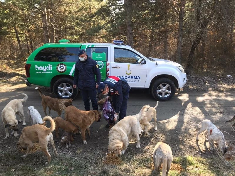 Kastamonu’da jandarma ekipleri sokağa çıkma kısıtlaması nedeniyle yiyecek bulmakta zorlanan sokak hayvanlarını besledi.