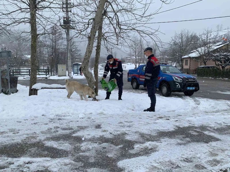 Sakarya’nın Sapanca ilçesinde kar yağışının ardından jandarma ekipleri sahipsiz sokak hayvanlarını unutmadı.