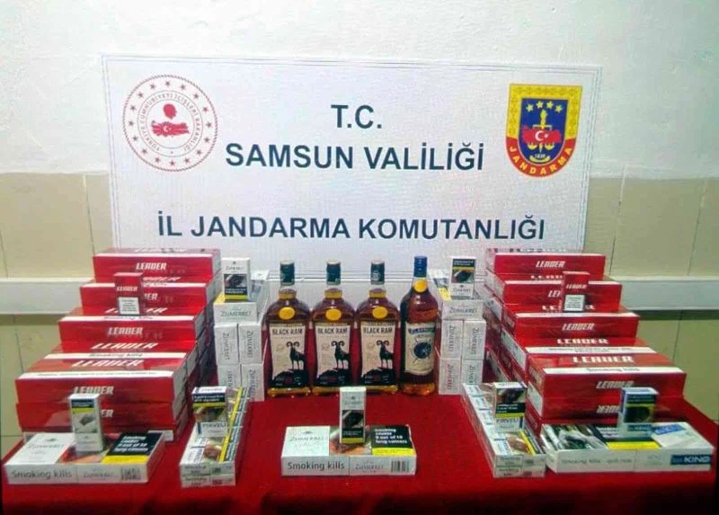 Samsun’da jandarma ekipleri tarafından şüphe üzerine durdurulan bir araçta yapılan aramada kaçak içki ve sigara ele geçirildi.