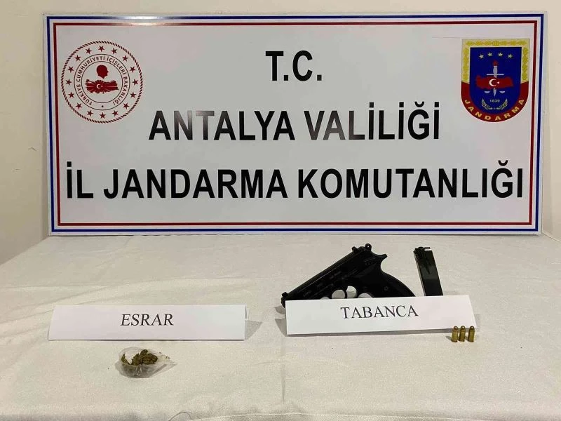 Manavgat ilçesi Ilıca Mahallesinde ikamet eden Ü.A. isimli şahsın, S.E. isimli şahıs tarafından tehdit edildiği yönündeki şikayeti jandarmayı harekete geçirdi. Manavgat Cumhuriyet Başsavcılığı koordinesinde; Manavgat İlçe Jandarma Komutanlığı ekipleri tarafından S.E. isimli şüphelinin ikametinde yapılan aramada; 4 gram esrar uyuşturucu maddesi, 1 adet tabanca, 1 adet şarjör ve 3 adet fişek ele geçirildi.