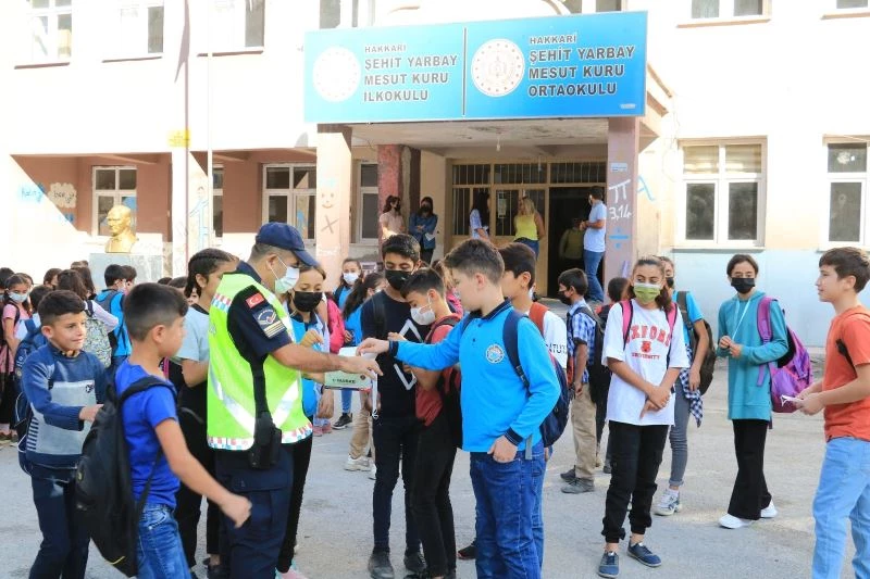 Hakkari İl Jandarma Komutanlığı ekipleri tarafından okul servis araçlarını denetleyerek, öğrencilere maske dağıttı.
