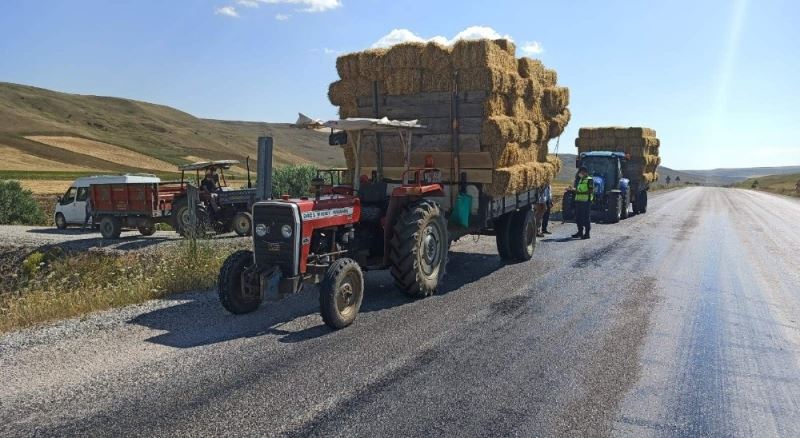 “Tarım ürünlerinin toplanması, yüklenmesi veya boşaltılması amacıyla tarla veya iş yerlerinde götürüp getirmek üzere lastik tekerlekli traktörlerin, bağlı römork veya yarı römorkların ışık donanımları eksiksiz olması, arka kısımlarına yansıtıcı şeritler ve reflektör takılması. Traktörlerde flaşörlü yanıp sönen sarı ışıklı dönerli uyarı lambası kullanılır durumda olması, traktörlerin zorunlu olmadıkça karayoluna çıkmaması. Biçerdöverlerin ise gece karayoluna hiçbir şekilde çıkmadan, gündüz karayolunu kullanması gerektiğinde biçerdöverin önündeki tablo sökülerek seyir etmesi. Traktör römorklarında, trafik güvenliği açısından gerekli güvenlik tedbirleri alınmadan insan taşınmaması, araçların çamurluk, basamak, karasör kenarında, sürücü mahallinin veya aracın üstü gibi dış kısımlarda insan taşınmaması. Traktör römorklarına, yandan ve arka kısımdan sarkacak, karayoluna değecek, düşecek, saçılacak, akacak şekilde yükleme yapılmaması, yükler sağlam olarak yerleştirilerek ve bağlanarak, kasanın yan ve arka kapakları kapalı olarak, yüklerin üzerine hiçbir şekilde yolcu bindirilmemesi büyük önem arz etmektedir”