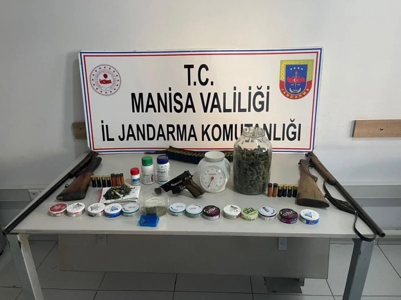 Manisa İl Jandarma Komutanlığına bağlı Akhisar İlçe Jandarma Komutanlığı JASAT, İstihbarat ve Merkez Jandarma Karakol Komutanlığı tarafından yapılan istihbari çalışma neticesinde Akhisar ilçesine bağlı Medar Mahallesi’nde ikamet eden şüpheli R.G. (45) isimli şahsın yazlığında kapalı alanda uyuşturucu bitkisi yetiştirdiği ve elde ettiği uyuşturucu maddeleri aynı mahallede ikamet eden şüpheli H.Ç. (31) isimli şahıs tarafından parça parça satışının yaptırıldığı tespit edildi. Adli makamlardan alınan arama kararının ardından, şüpheli şahısların ikametlerinde ve eklentilerinde Manisa Emniyet Müdürlüğüne bağlı narkotik köpek timi, JASAT, OYİT ve Asayiş ekipleri ile beraber eş zamanlı arama yapıldı. Yapılan aramada, H.Ç isimli şahsın evinde ve eklentilerinde, beyaz kutu içerisinde yaklaşık 10 gram esrar olarak değerlendirilen madde, 1 adet kuru sıkı tabanca ayrıca R.G. isimli şahsın evinde ve eklentilerinde, 39 adet kenevir tohumu, 10 adet kutu içerisinde parça parça toplam 140 adet nikotin olarak değerlendirilen madde, kutu içerisinde yaklaşık 10 gram toz halinde esrar olarak değerlendirilen madde, esrar elde etmek için kullanılan 3 adet 100 gramlık sıvı madde, 2 adet ruhsatsız av tüfeği, şişe kavanoz içerisinde yaklaşık 1 kilogram kurutulmuş skank (esrar) madde ve 1 adet hassas terazi tespit edildi. Suç eşyalarına el konulurken Akhisar Nöbetçi Cumhuriyet Savcısının talimatı doğrultusunda şüpheli H.Ç.’nin kan ve idrar örnekleri ve ifadesinin alınmasının ardından serbest bırakıldı. Diğer şüpheli R.G. isimli şahsın firari olarak yakalama çalışmalarının devam ettiği bildirildi. Ayrıca el konulan tüfek ve kuru sıkı tabanca hakkında şahsa idari yaptırım uygulandığı öğrenildi.