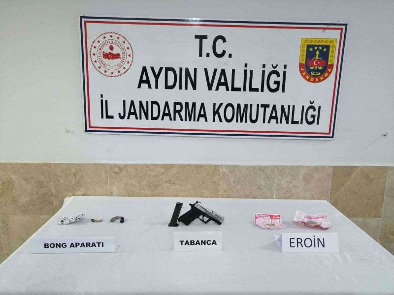 Aydın İl Jandarma Komutanlığı Kaçakçılık ve Organize Suçlarla Mücadele Şube Müdürlüğü ekipleri tarafından yapılan çalışmalar çerçevesinde 2 şüpheli şahsın üzerinden uyuşturucu madde ele geçirilirken, şüphelilerden birinin kullandığı otomobilde kuru sıkı tabanca bulundu.