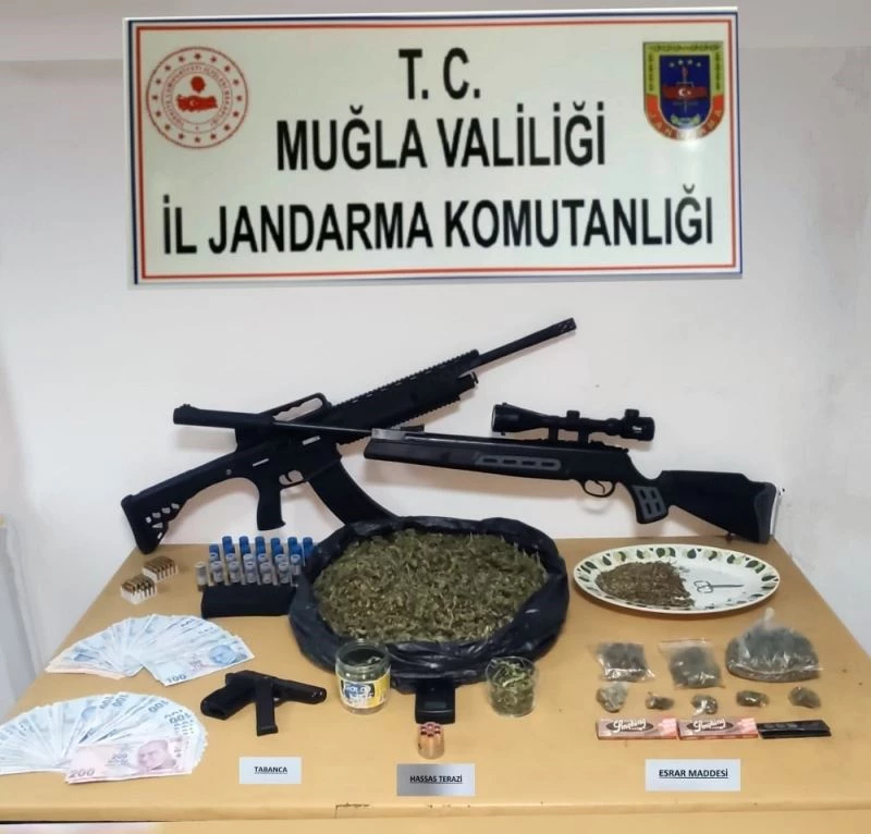 Şahsın ikametinde arama yapılan aramada, 1550 gr. kubar esrar, uyuşturucu öğütme ve kullanma aparatı, hassas terazi, tabanca, 45 adet 7,65 mm. tabanca mermisi, yarı otomatik seri numarası silinmiş av tüfeği, 2 adet tüfek şarjörü, 12 cal tüfeğe ait 25 adet fişek, havalı taktikal dürbünlü tüfek, zıpkın, 8bin 200 TL nakit para ele geçirildi.