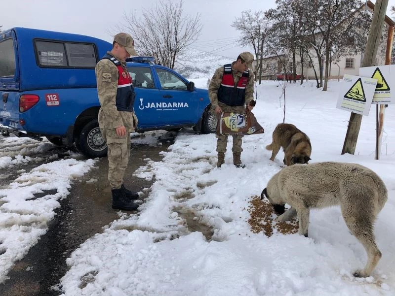 Erzincan’ın İliç ilçesinde jandarma ekipleri, etkili olan kar yağışının ardından yiyecek bulmakta zorlanan sokak hayvanlarına mama desteğinde bulundu.